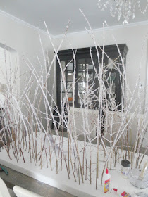 Anyway, she wanted tall winter wonderland type centerpieces with "Icy" branches dripping with snowflakes and that would contrast nicely with black tablecloths.